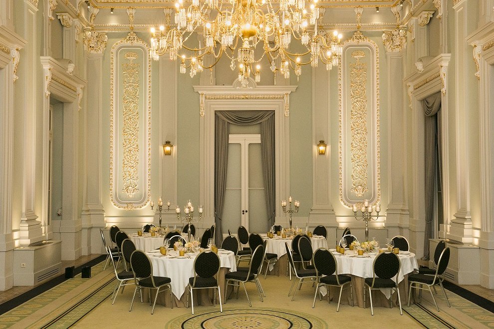 Um espaço de grande prestígio, adequado para um almoço formal. A imponência do Salão Nobre confere solenidade ao momento, sublinhando o reconhecimento e o compromisso da Medway com práticas sustentáveis no setor dos transportes.